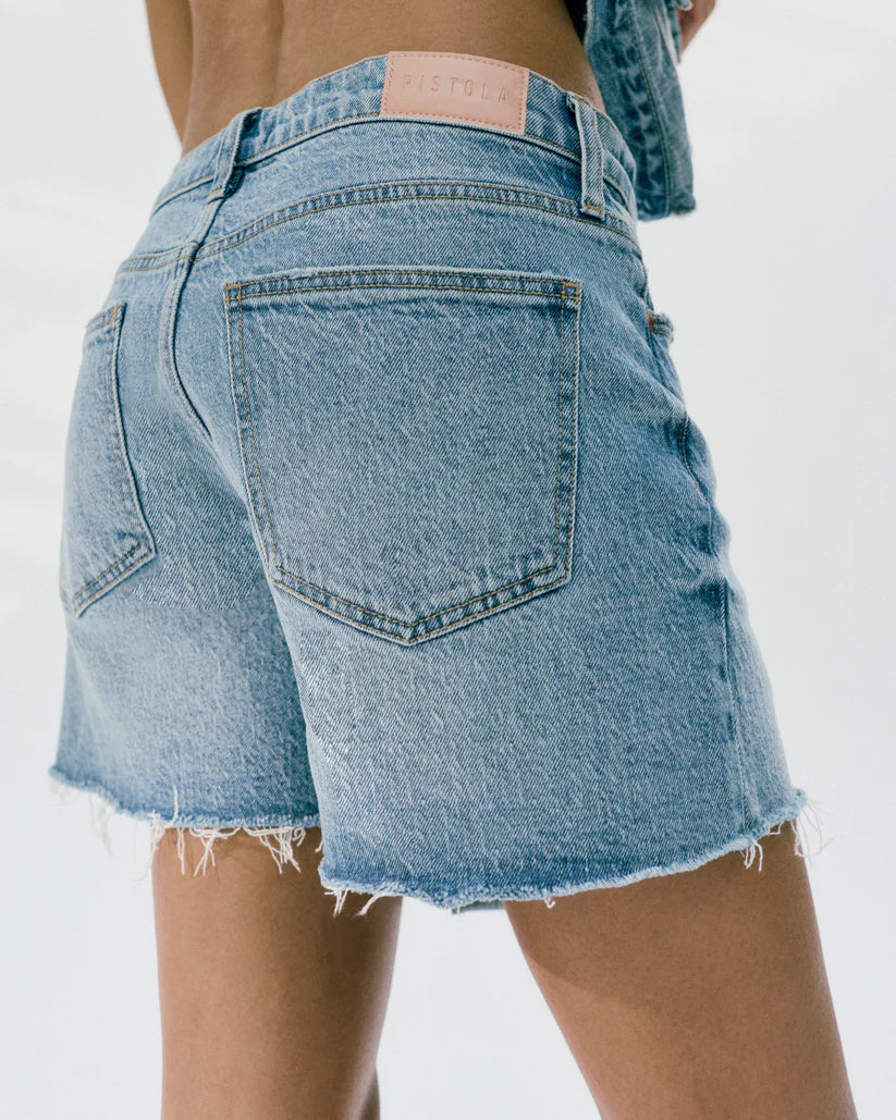 A warm-weather staple, Kennedy has a balanced mid rise with a relaxed, easy drape. The medium-length 4.5" inseam creates a versatile proportion—easy to style, endlessly comfortable. Crafted from our signature comfort stretch denim, Escape, a sun-washed blue, channels a softly faded feel.