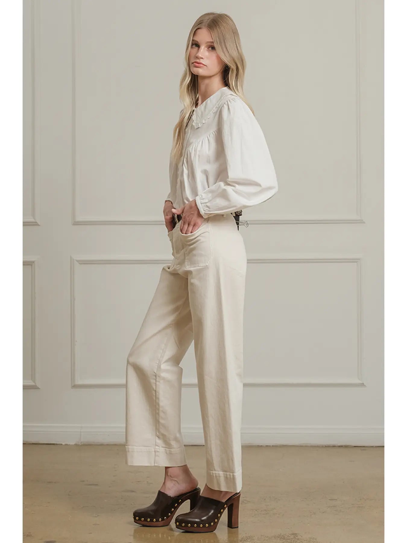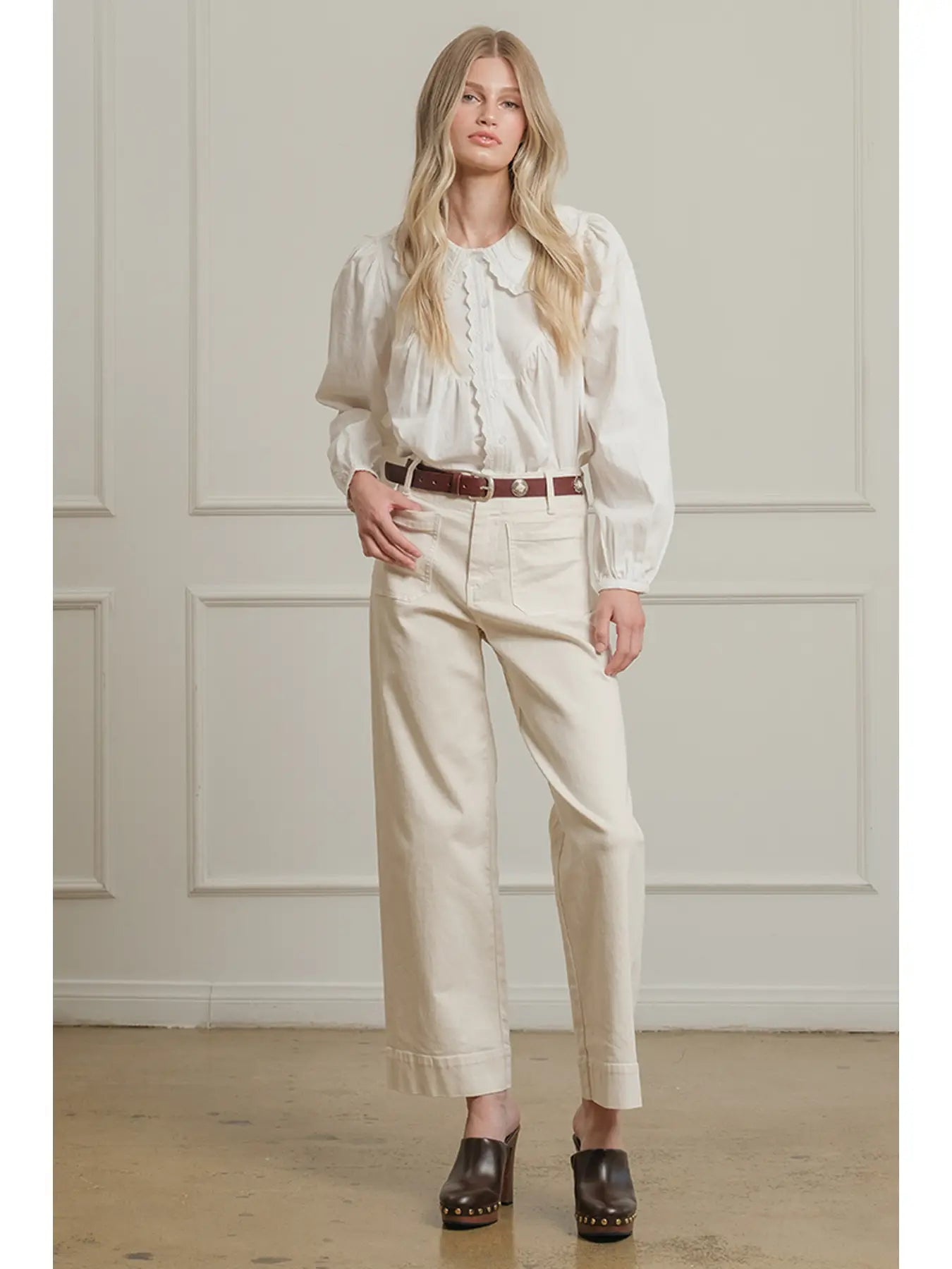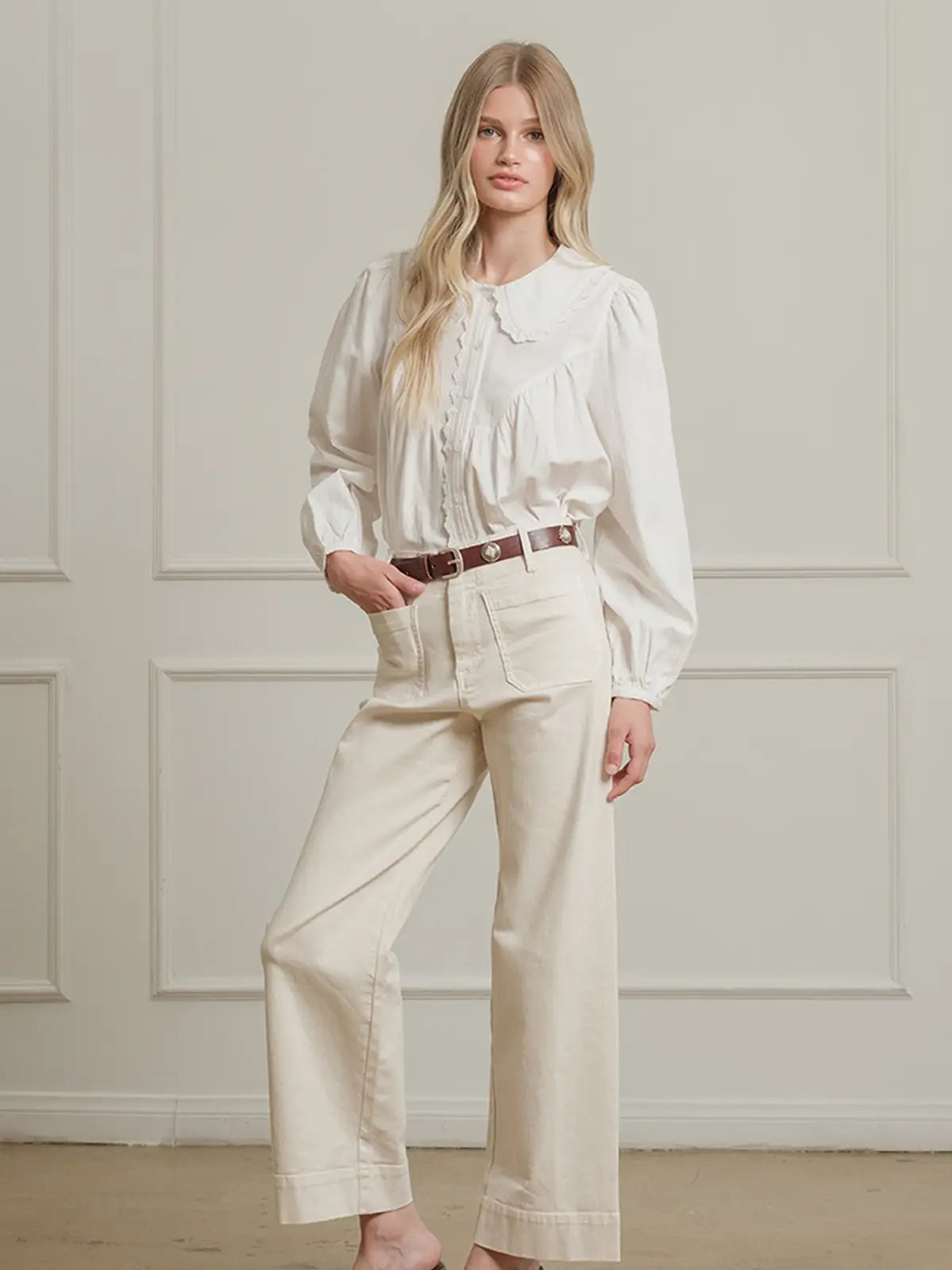 Elevate your everyday wardrobe with this 100% cotton blouse featuring a charming round collar with scalloped edging. The breathable cotton fabric ensures comfort, while the voluminous sleeves and gathered details bring a touch of vintage romance. Perfect for boutique collections looking for versatile and feminine pieces that transition seamlessly from workday to weekend. Lightweight, breathable cotton Romantic round collar with scallop trim Button-down closure Long sleeves with gathered cuffs Easy to pair with denim, skirts, or trousers - Model wears size S - Model height: 174 cm 100% COTTON