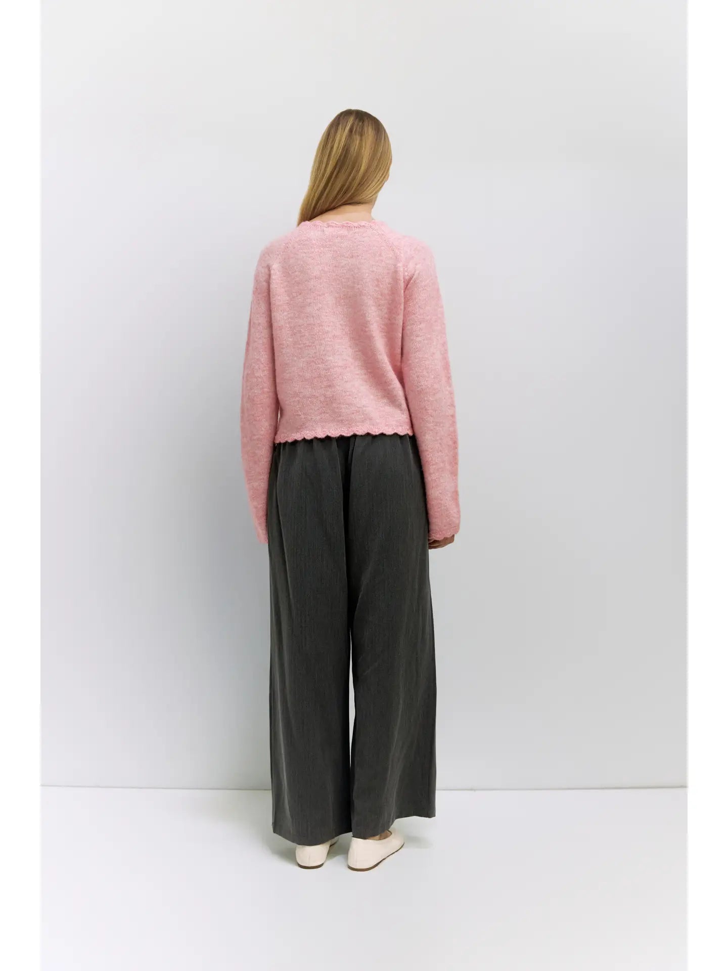 The Tiffany Cardigan is crafted from a heavyweight knit with a relaxed, comfortable fit. Featuring raglan long sleeves, a crewneck, and a full button front—all finished with delicate scallop-edge detailing—it brings subtle, refined texture to a classic layering piece.