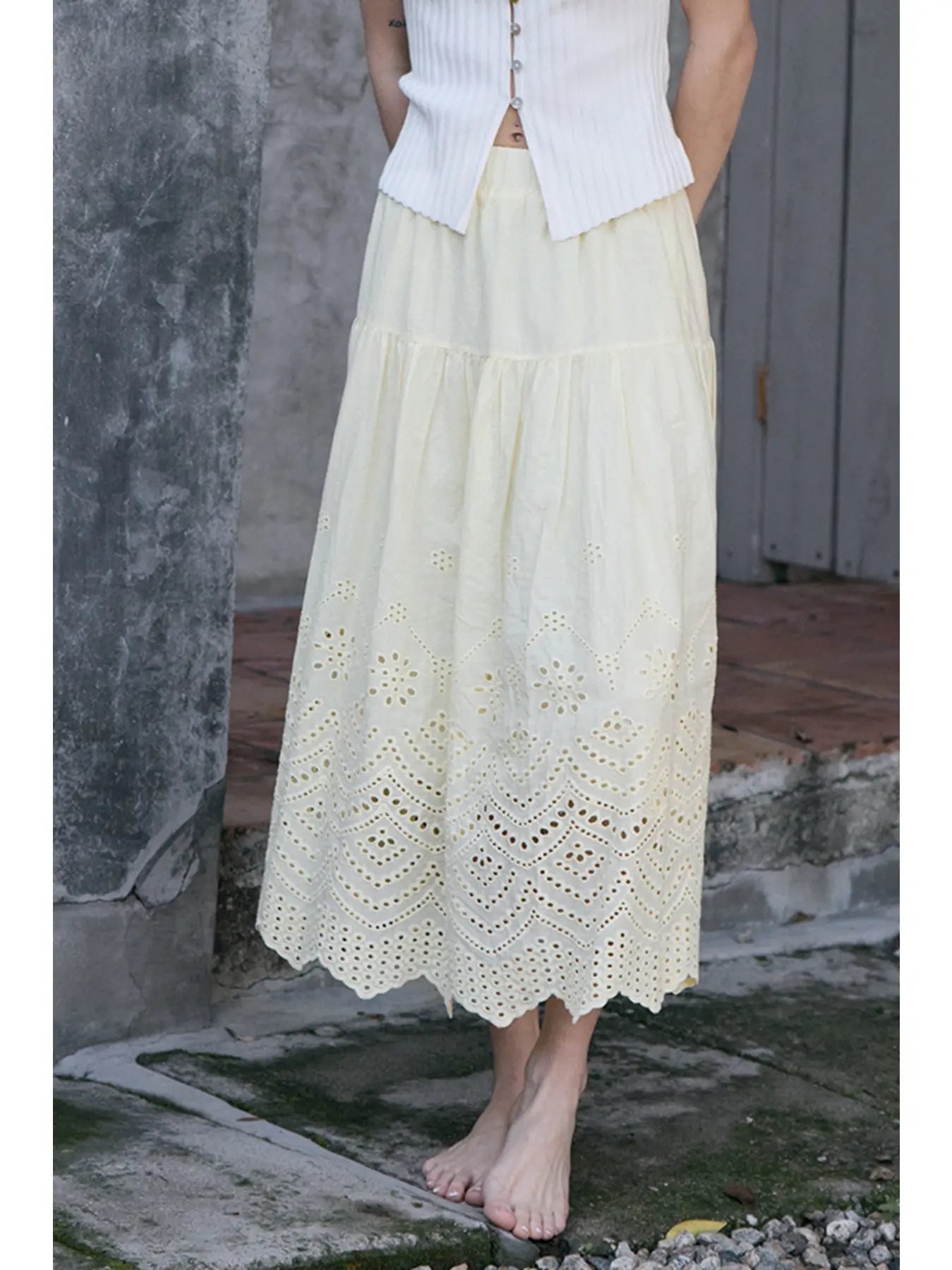 A beautifully feminine cotton midi skirt featuring delicate embroidered eyelet details along the hem. Designed with a soft tiered silhouette, this skirt offers effortless movement and a light, airy feel—perfect for spring and summer styling. Pair it with tanks, blouses, or knit tops for an easy elevated look. - Embroidered eyelet hem - Tiered silhouette - Midi length - Lined ** Model: 170 cm (5'7") wearing size Small